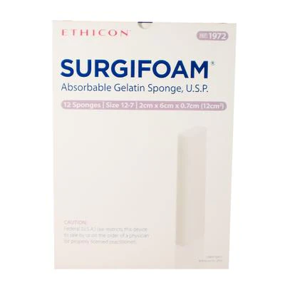 Surgifoam® Absorbable Gelatin Sponges, U.S.P. are porcine gelatin absorbable sponges intended for hemostatic use by applying to a bleeding surface.