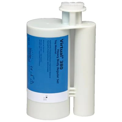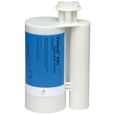 Virtual® 380 is a vinyl polysiloxane impression material offered in large cartridges for automatic mixers such at Pentamix, Plug&Press Dispenser and MixStar. Indications include final impressions; dental implant impressions; silicone matrices for wax-ups, study models or treatment planning; edentulous impressions and silicone matrices used to create temporary restorations. Coordinated for all of the Virtual wash materials, Virtual 380 is available in two consistencies, heavy body and monophase and fast and regular set times (monophase is available in fast set only).